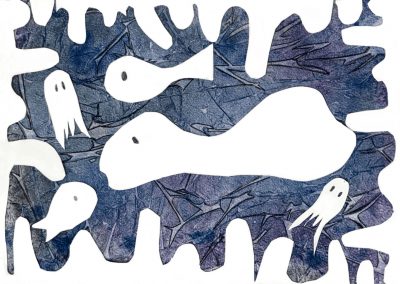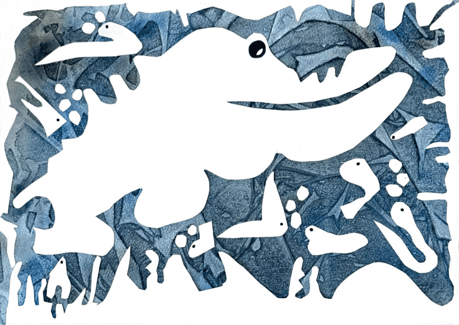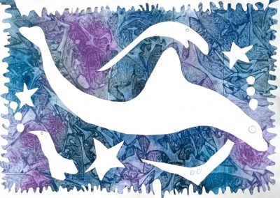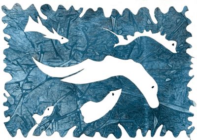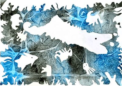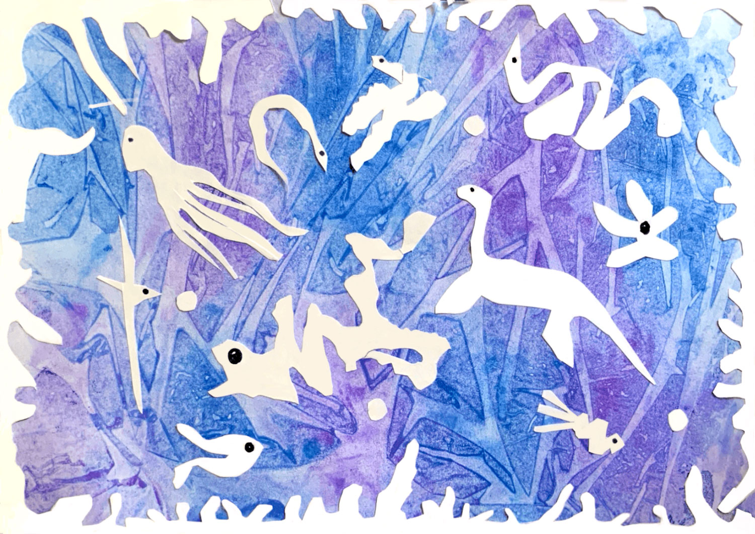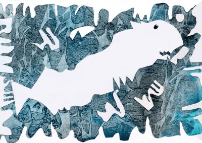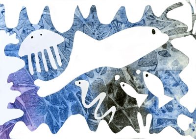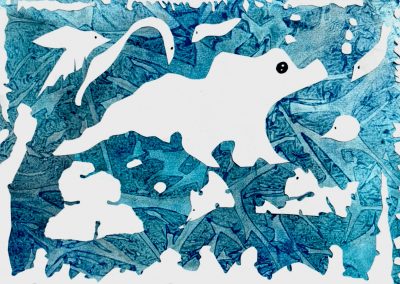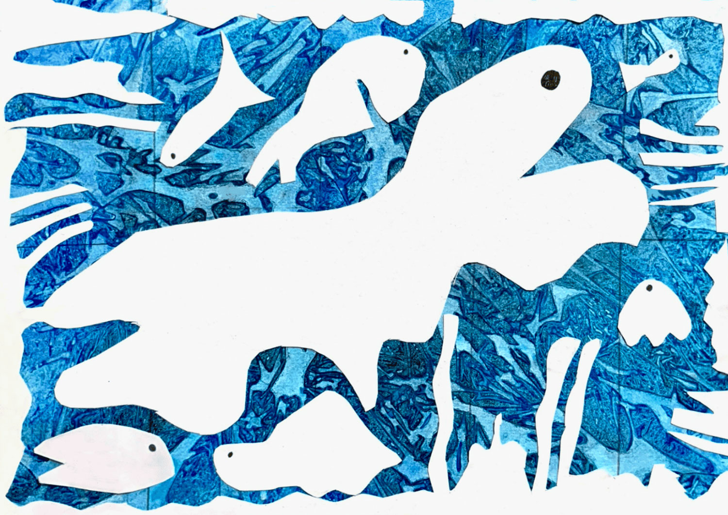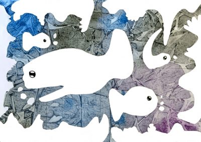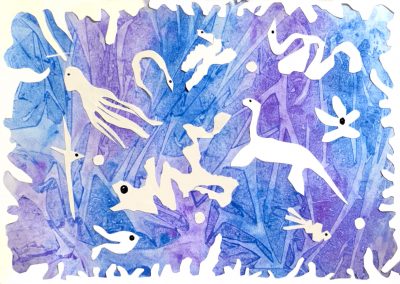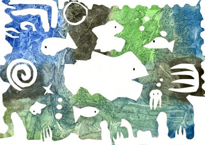 Technik: Der Hintergrund wurde mit der Aquarelltechnik „Nass-in-Nass“ gestaltet. Anschließend wurde Frischhaltefolie auf die feuchte Farbe gelegt, zerknittert und nach dem Trocknen entfernt. So entstanden spannende Strukturen, die an Steine oder Unterwasserlandschaften erinnern. Darauf wurden ausgeschnittene Papierformen als Collage aufgeklebt.